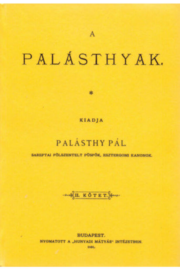 A Nyitra megyei Palást községből származó magyar nemesi család a Palásthyak nemzetsége. A három kötetes munka a család történetét mutatja be a rá vonatkozó levéltári források közreadásán keresztül.