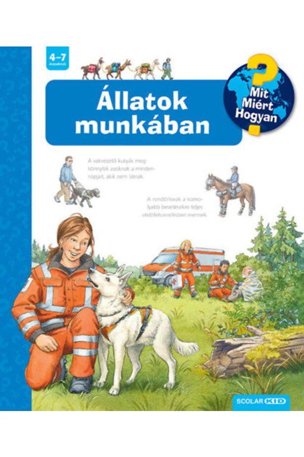 A Ravensburger népszerű Mit? Miért? Hogyan? gyermekkönyvsorozatának 58. kötetét lapozgatva az óvodások és a kisiskolások megtudhatják, milyen állatok lehetnek a segítőtársaink és hogyan tudnak nekünk segíteni, mit csinálnak a kutyák a rendőrségen, ki segít a vízi baleseteknél, hogyan gyakorolnak a segítőállatok.