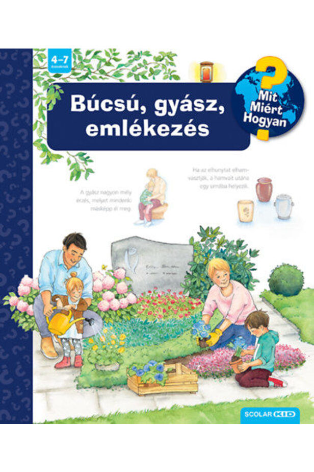 A Ravensburger népszerű Mit? Miért? Hogyan? gyermekkönyvsorozatának 69. kötetét lapozgatva az óvodások és a kisiskolások megtudhatják, mikor veszünk búcsút, mikor ér véget az élet, milyen érzés a gyász, mi nyújt vigaszt, hogyan zajlik a temetés, hogyan tudunk emlékezni.