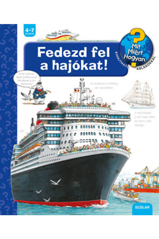 A Ravensburger népszerű Mit? Miért? Hogyan? gyermekkönyvsorozatának 41. kötetét lapozgatva a hajók felépítésével, a hajózás történetének fontos állomásaival és a különféle hajótípusokkal ismerkedhetnek az óvodások és a kisiskolások. Azt is megtudhatják, mi mozgatja a hajókat, kikből áll a legénység, hogyan készülnek a hajók, mi történik a kikötőben, mi minden található egy óceánjáró hajón.