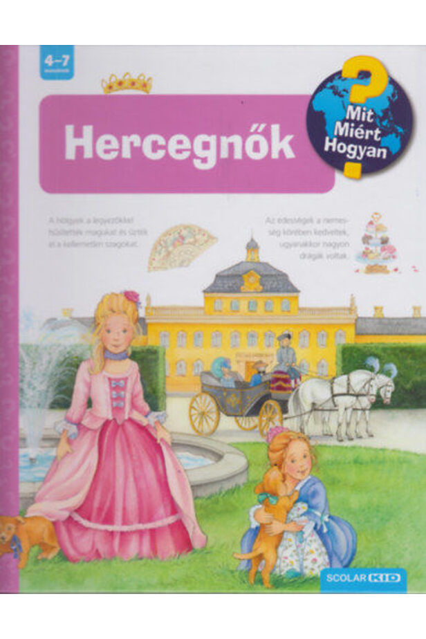 A Ravensburger népszerű Mit? Miért? Hogyan? gyermekkönyvsorozatának 42. kötete a királyi kastélyok világába kalauzolja az óvodásokat és a kisiskolásokat. A könyvet lapozgatva megtudhatják, hogyan teltek a különböző korokban élt hercegnők napjai, milyen ruhákat hordtak, hogyan szépítkeztek, kivel találkoztak a báli forgatagban. A könyv végén még egy kivágható öltöztetős babát is találnak.