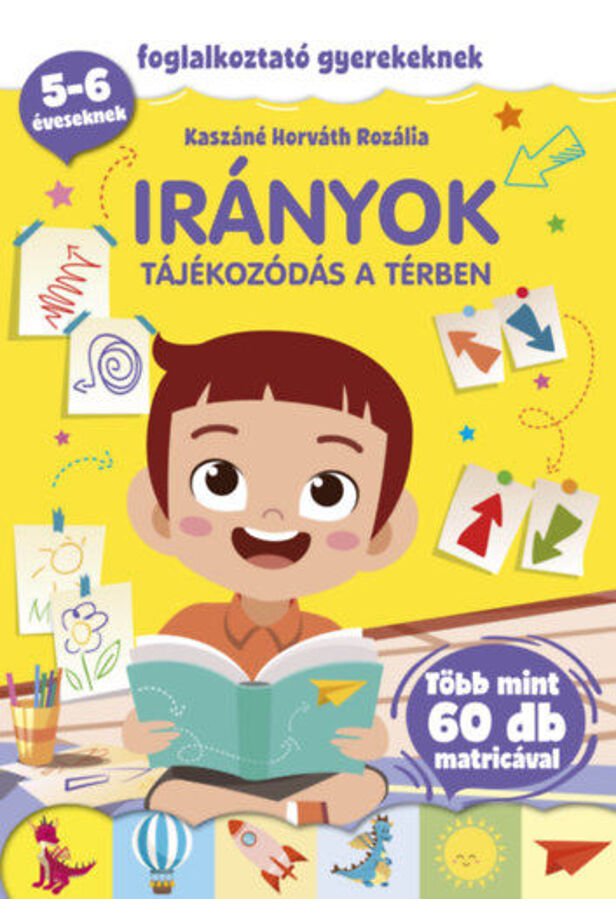 A foglalkoztatóban található játékos, érdekes feladatok segítik a gyermek téri tájékozódásának kialakulását. Szórakozva tanulhatja meg az előtte, mögötte, mellette, fölötte, a jobb és a bal oldal fogalmát. A matricák beragasztása segíti a figyelem és a finommotorika fejlesztését.