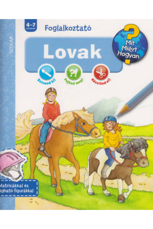 A Ravensburger Mit? Miért? Hogyan? Foglalkoztató sorozatának e kötete a lovakkal ismerteti meg az apróságokat. Milyen különbségek vannak a lovak között? Mire használjuk a lovakat? Hogyan lehet megtanulni lovagolni? Milyen felszerelésre van szüksége a lónak és a lovasnak? Hogyan kell ápolni a lovakat? Színezd ki!, Fejtsd meg! és Készítsd el! a feladatokat megoldva a gyerekek megkapják a választ a kérdésekre, és még a lasszódobást is megtanulhatják..
