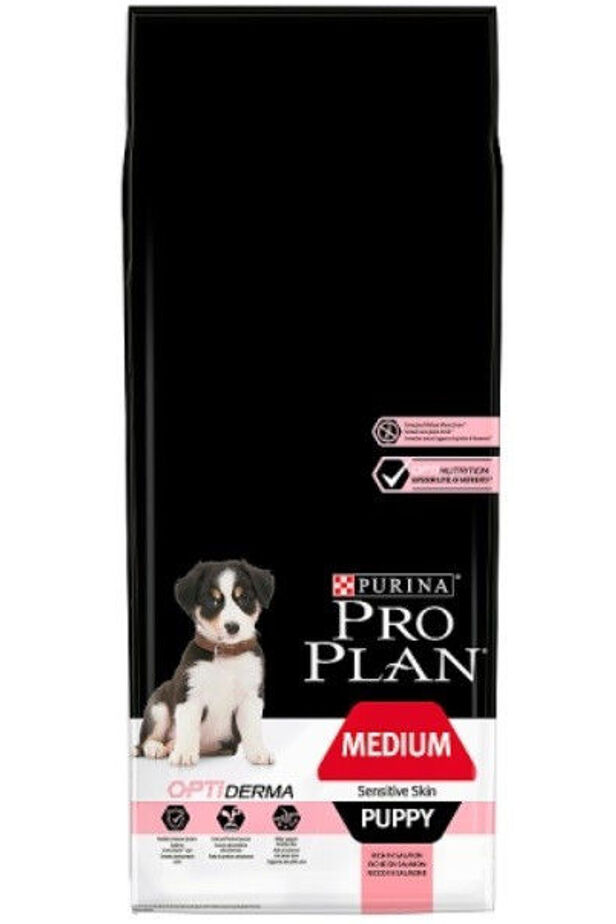 Purina® Pro Plan® Medium Puppy Sensitive Skin is a dry dog food specially developed for puppies with sensitive skin and is suitable for both pregnant and lactating dogs. This balanced puppy food contains the Optiderma® formula, a combination of special ingredients to suit the age and average physique of your puppy. It is clinically proven to help support healthy skin and promote naturally healthy hair. Our recipe also includes nutrients that support the healthy joints needed for an active lifestyle as well as a healthy immune system so puppies can face everyday challenges. This complete dry dog food has salmon-rich, assorted protein sources to help reduce the incidence of skin discomfort associated with food sensitivity. If your medium-sized puppy has sensitive skin, try this complete dry food today!