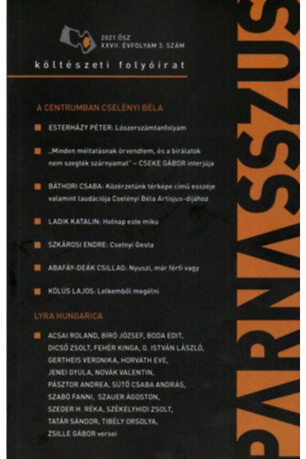 IN THE CENTER BÉLA CSELÉNYI Péter Esterházy: Horse tool course "I enjoyed all the praise, and the reviews didn't break my wings" -Deák Csillag: Bunny, already a man or Lajos Kölüs: Living from my soul LYRA HUNGARICA Roland Acsai, József Bíró, Edit Boda, Zsolt Dicső, Kinga Fehér, László G. Gertheis, Eve Horváth, Gyula Jenei, Andrea Novák Poems by András Csaba Sütő, Fanni Szabó, Ágoston Szauer, Réka H. Szeder, Zsolt Székelyhidi, Sándor Tatár, Orsolya Tibély, Gábor Zsille