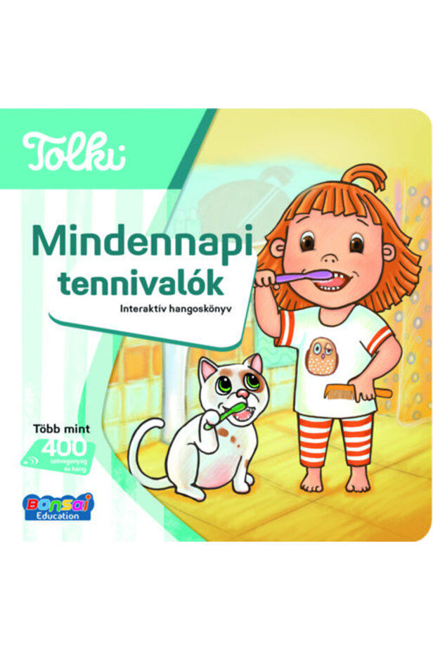 "Egy csodás nap! Tölts el egy izgalmas napot Mátéval, Emmával, valamint Bobi kutyával és Mimi cicával! Hallgass velük együtt verseket és dalokat, játssz kvízjátékokat! Jó szórakozást! A Mindennapi tennivalók 12 oldalon mutatja be a gyerekeknek az olyan hétköznapi tevékenységeket, mint az öltözködés, a tisztálkodás vagy az étkezés. A vidám képekhez kedves, érthető magyarázatok és versek tartoznak. A könyv narrátora Farkasházi Réka. A könyvhöz tartozó dalokat is az ő előadásában hallhatod - a dalokat pedig a Farkasházi Réka és a Tintanyúl együttes szerezte.A könyv játékos formában ad át fontos, a hétköznapi életben használható ismereteket, valamint fejleszti a gyerekek képzelőerejét, hallás utáni szövegértését, szem-kéz koordinációját, memóriáját és logikai képességeit is. A Tolki egyedi oktatási módszere ötvözi a hagyományos könyvek és az okoseszközök használatát. - FIGYELEM! A könyv használatához szükség van egy Tolki készletből származó elektronikus tollra! A tollat ez a termék nem tartalmazza!!